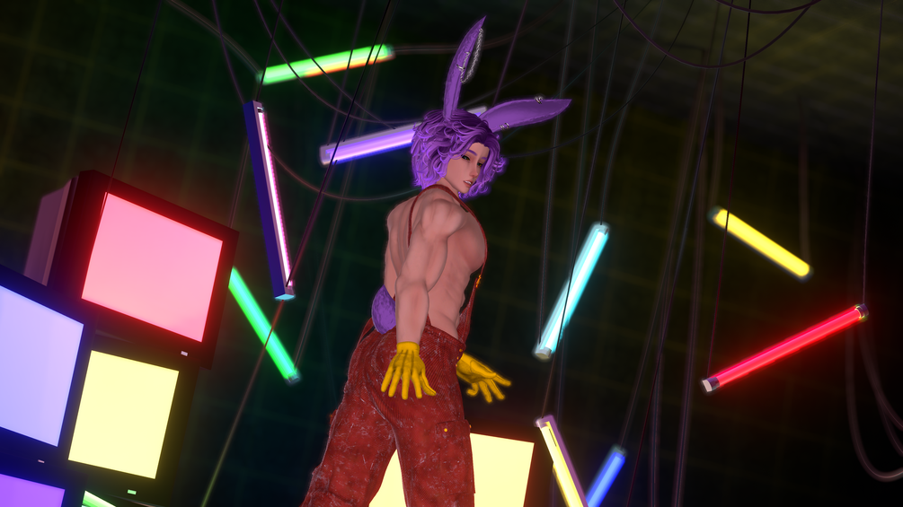 Mask, gloves, fishnet top, opened shirt, overalls, pants, tail, ears, half up hair, long hair, short curly hair, short hair, boots, platform boots, shoes, earrings, earbuds, collar and "extra attachments"