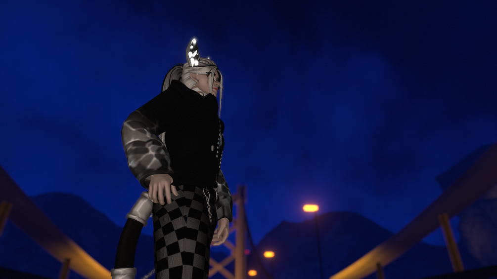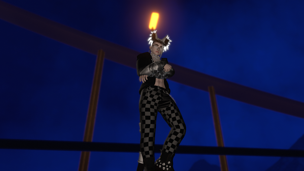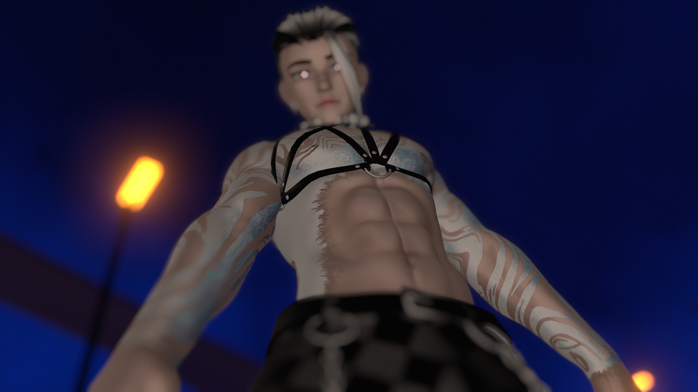 Jacket, sweater, harness, pants, boots, glasses, thong, cat parts, ponytail, man bun, and and "extra attachments"