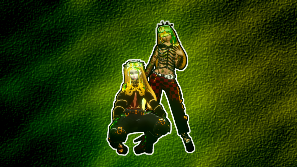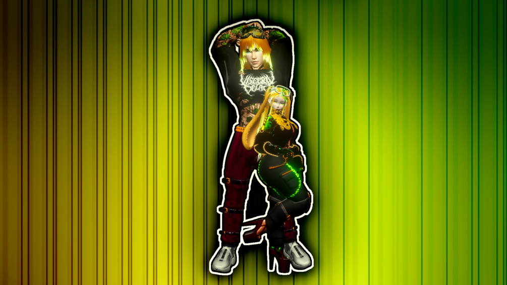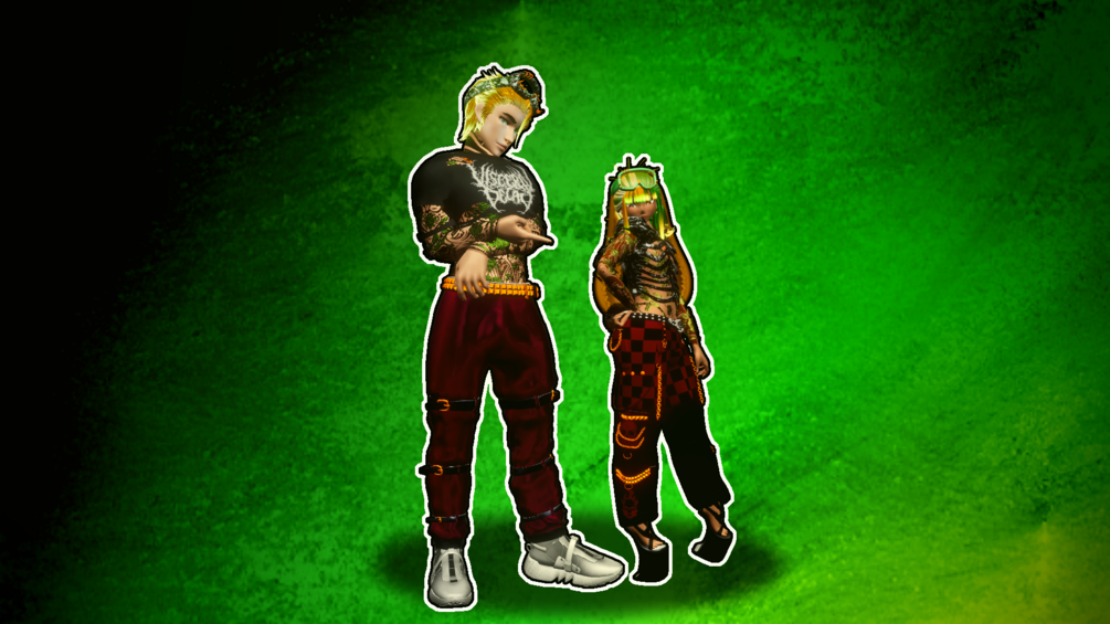 Slick hair, long hair, over the shoulder hair, ripped croptop, fishnet top, buckle strap pants, sneakers, formal top, formal pants, formal shoes, necklace, goggles, bunny parts, belt, thong, and "extra attachments"